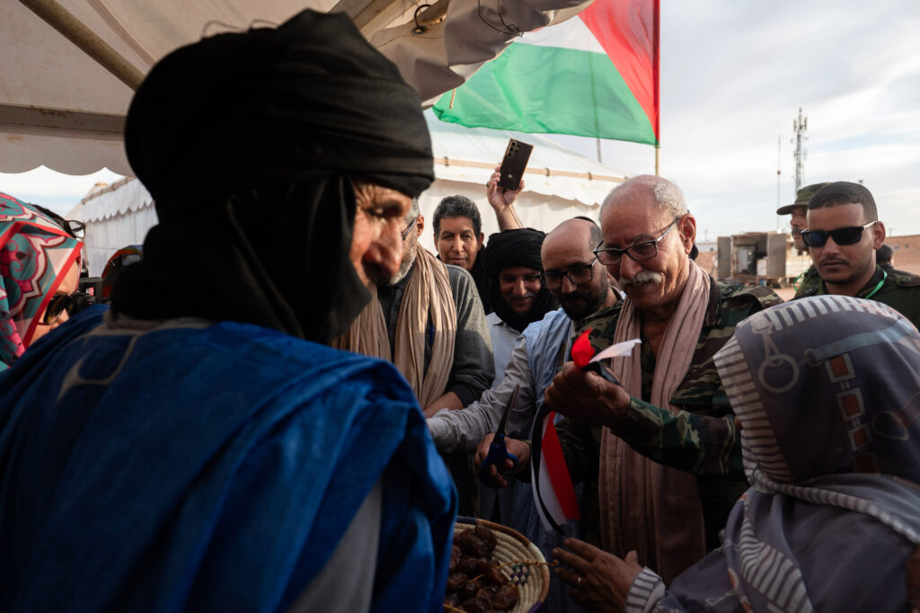 La tarde comenzaba con la apertura oficial de LeFrig, para cuya puesta de largo acudió el presidente de la RASD (República Árabe Saharaui Democrática), Brahim Ghali; su primer ministro Bucharaya Hamudi Beyun y el ministro de Cultura y Juventud, Musa Salma, entre otras autoridades. La multitud arropó a Ghali a lo largo de su recorrido por esta exhibición de jaimas tradicionales en las que las distintas wilayas y dairas (distritos) de Ausserd compiten durante la semana en artes populares y usos y costumbres saharauis (comida típica, música y danzas, juegos tradicionales…).